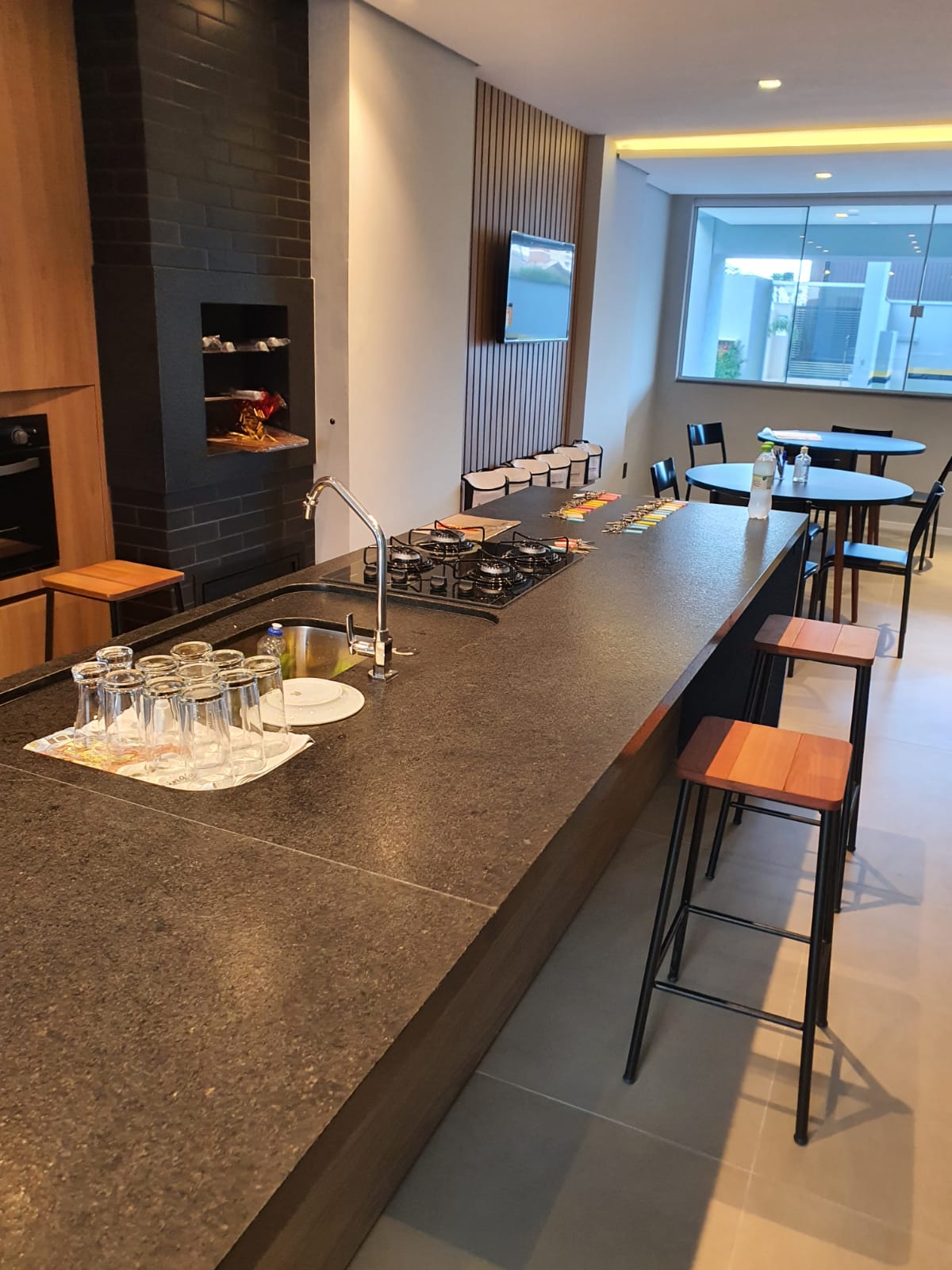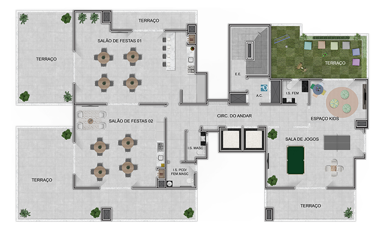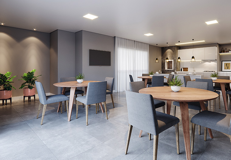 Espaço desenhado para tornar os encontros mais agradáveis. Com design de interior moderno, o salão de festas é destinado a happy hours, aniversários e até confraternizações do moradores. Sempre priorizando ser feliz por natureza na sua forma mais autêntica.