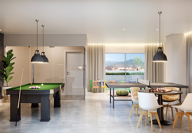 A sala de jogos é um área de lazer destinado aos moradores de qualquer faixa etária. Possui uma brinquedoteca voltada às crianças, jogos estratégicos para quem se arriscar, mesa de ping pong para garantir as risadas e mesa de bilhar. Nesse espaço a diversão é garantida.